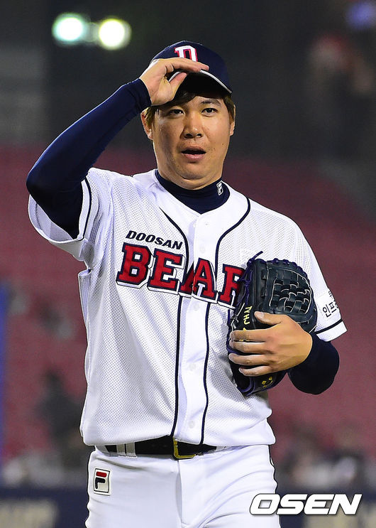 10일 오후 서울 잠실야구장에서 열린 '2014 한국야쿠르트 세븐 프로야구' 두산 베어스와 SK 와이번스의 경기, 6회초 2사 1,2루 두산 이현승이 무실점으로 이닝을 마치고 더그아웃으로 들어가고 있다.