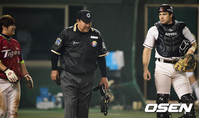 10일 목동 야구장에서 벌어진 2014 한국프로야구 넥센 히어로즈와 KIA 타이거즈의 경기, 7회초 1사 주자 2루 KIA 차일목 타석에서 2루 주자 김선빈이 3루 도루에 성공했을때 송구가 빠지자 홈으로 몸을 날렸다. KIA 김선빈은 넥센 로티노 포수에게 태그아웃을 당한 후 최수원 코치에게 항의할때 넥센 포수 로티노가 김선빈을 바라보고 있다.