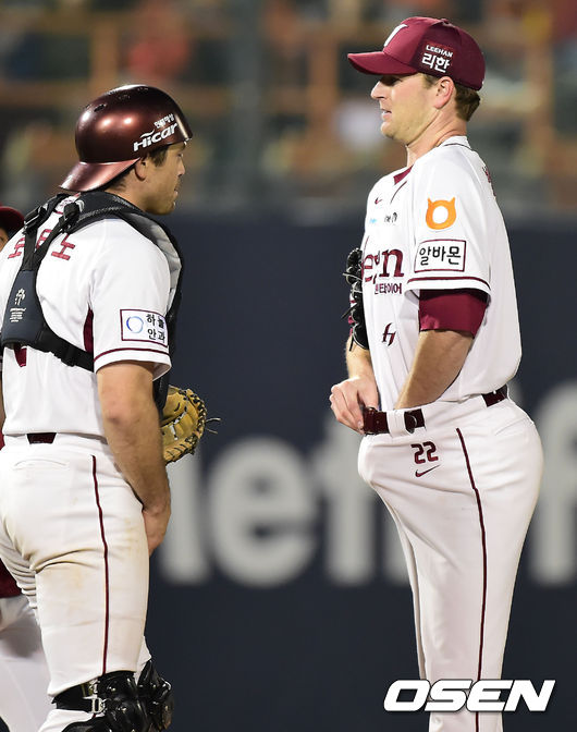 10일 목동 야구장에서 벌어진 2014 한국프로야구 넥센 히어로즈와 KIA 타이거즈의 경기, 7회초 1사 주자 없는 상황에서 넥센 로티노 포수가 마운드에 올라 선발 밴헤켄과 얘기를 나누고 있다.