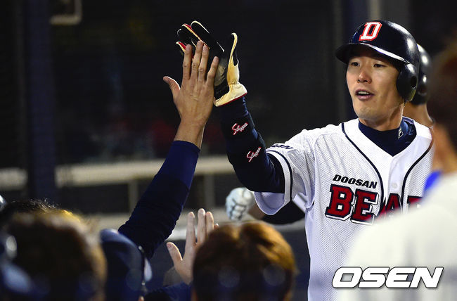 10일 오후 서울 잠실야구장에서 열린 '2014 한국야쿠르트 세븐 프로야구' 두산 베어스와 SK 와이번스의 경기, 6회말 2사 만루 두산 김재호가 민병헌이 안타로 득점을 올린 뒤 동료들과 기뻐하고 있다.