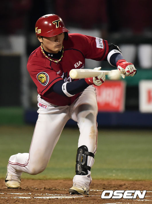 10일 목동 야구장에서 벌어진 2014 한국프로야구 넥센 히어로즈와 KIA 타이거즈의 경기, 7회초 무사 주자 1루 KIA 김민우가 희생번트에 성공하고 있다.