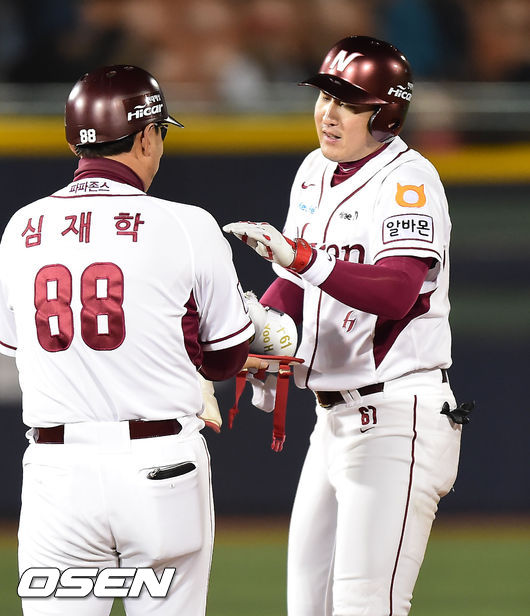 10일 목동 야구장에서 벌어진 2014 한국프로야구 넥센 히어로즈와 KIA 타이거즈의 경기, 8회말 2사 주자 1,3루 넥센 유한준이 2타점 적시타를 날린 후 2루에서 심재학 코치와 하이파이브를 하고 있다.