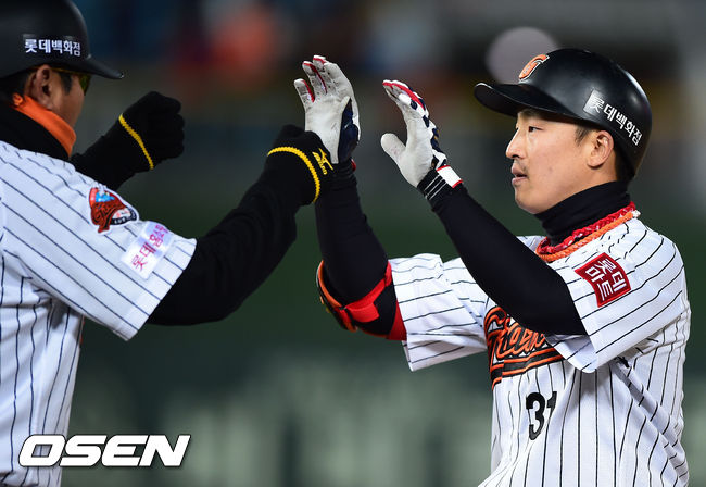10일 오후 부산 사직구장에서 열린 '2014 한국야쿠르트 세븐 프로야구' 롯데 자이언츠와 LG 트윈스의 경기, 8회말 1사 1,2루 롯데 손아섭이 선취 1타점 적시타를 날리고 김응국 코치와 하이파이브를 하고 있다