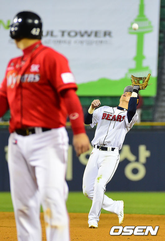 10일 오후 서울 잠실야구장에서 열린 '2014 한국야쿠르트 세븐 프로야구' 두산 베어스와 SK 와이번스의 경기, 7회초 1사 만루 두산 고영민이 SK 김강민의 내야 뜬공을 잡아내고 있다.