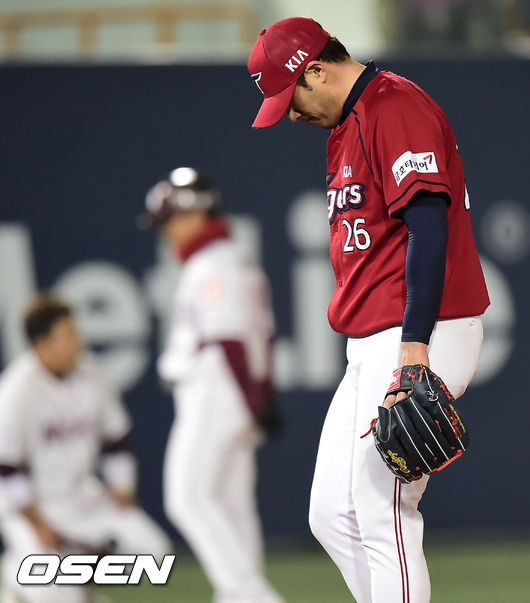 10일 목동 야구장에서 벌어진 2014 한국프로야구 넥센 히어로즈와 KIA 타이거즈의 경기, 8회말 2사 주자 1,2루 넥센 서건창의 1타점 적시타를 맞은 KIA 서재응이 고개를 숙이고 있다.