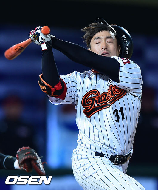 10일 오후 부산 사직구장에서 열린 '2014 한국야쿠르트 세븐 프로야구' 롯데 자이언츠와 LG 트윈스의 경기, 8회말 1사 1,2루 롯데 손아섭이 헛스윙 하고 있다.