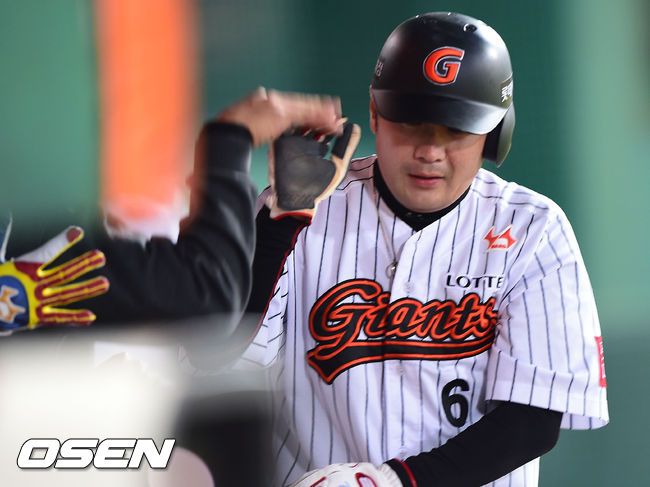 10일 오후 부산 사직구장에서 열린 '2014 한국야쿠르트 세븐 프로야구' 롯데 자이언츠와 LG 트윈스의 경기, 8회말 1사 1,2루 롯데 손아섭의 선취 1타점 적시타때 2루 주자 문규현이 선취득점을 올린후 동료들의 축하를 받고있다.