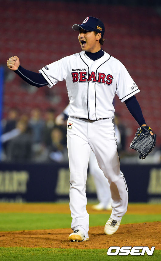 10일 오후 서울 잠실야구장에서 열린 '2014 한국야쿠르트 세븐 프로야구' 두산 베어스와 SK 와이번스의 경기, 두산 정재훈이 7회초 무사 만루에 마운드에 올라 무실점으로 수비를 마친 뒤 포효를 하고 있다.