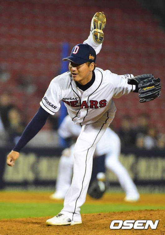 10일 오후 서울 잠실야구장에서 열린 '2014 한국야쿠르트 세븐 프로야구' 두산 베어스와 SK 와이번스의 경기, 두산 정재훈이 7회 무사 만루에 마운드에 올라 역투하고 있다.