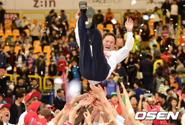 우승을 확정지은 모비스 유재학 감독이 선수들에게 헹가래를 받고 있다./sunday@osen.co.kr
