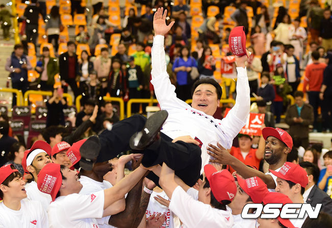우승을 차지한 모비스 김재훈 코치가 선수들의 헹가래를 받고 있다./sunday@osen.co.kr