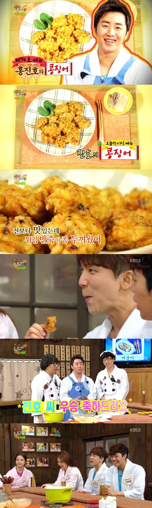 홍진호는 10일 오후 방송된 KBS 2TV 예능프로그램 '해피투게더3' 야간매점에서 오징어 김치 튀김을 선보였다.