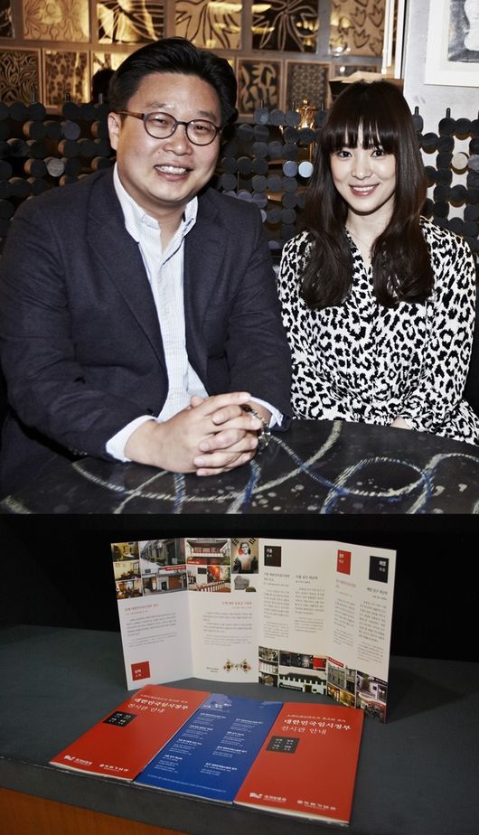 배우 송혜교와 서경덕 교수가 항주 임시정부청사에 한글안내서를 제공한다.