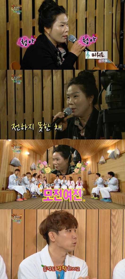 심봉선은 “어머니 조금만 더 연습하시면 정기고 씨와 ‘썸’도 가능하겠다”고 말해 웃음을 자아냈고 정기고는 “정말 잘하신다. 음정이 정확하다”고 감탄했다.