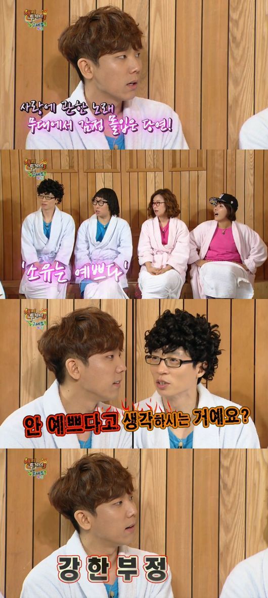 이에 유재석은 “지금 소유가 안 예쁘다고 생각하는 거냐”고 몰아세웠고 “지금 처음으로 당황한 것 같다”고 말했다. 이에 정기고는 “아니다. 당연히 예쁘다고 생각한다”며 “뻘쭘하기 때문에 자기 암시를 할 수 밖에 없다”고 덧붙였다.