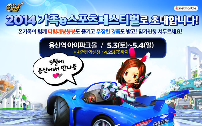 CJ E&M 넷마블은 모바일 캐주얼 레이싱게임 ‘다함께 붕붕붕’이 ‘2014 가족 e스포츠 페스티벌’의 스마트폰 게임대회 정식종목으로 선정돼 25일까지 사전 참가자를 모집한다고 11일 밝혔다.