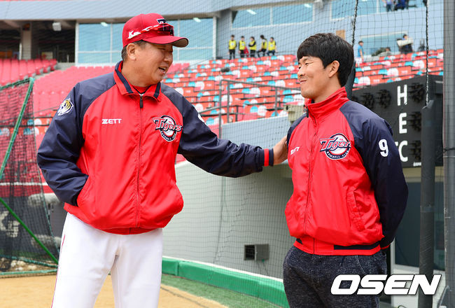 11일 오후 광주KIA챔피언스필드에서 '2014 한국야쿠르트 세븐 프로야구' KIA 타이거즈와 롯데 자이언츠의 경기에 앞서 KIA 선동렬 감독과 김병현이 인사를 나누고 있다.