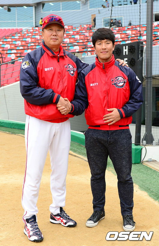11일 오후 광주KIA챔피언스필드에서 '2014 한국야쿠르트 세븐 프로야구' KIA 타이거즈와 롯데 자이언츠의 경기에 앞서 KIA 선동렬 감독과 김병현이 인사를 나누고 있다.