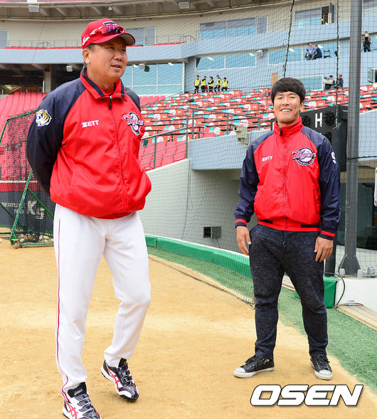 11일 오후 광주KIA챔피언스필드에서 '2014 한국야쿠르트 세븐 프로야구' KIA 타이거즈와 롯데 자이언츠의 경기에 앞서 KIA 선동렬 감독과 김병현이 인사를 나누고 있다.
