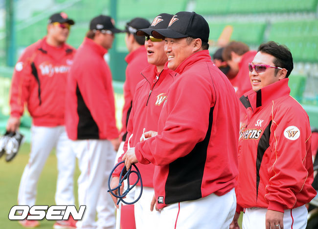 11일 오후 대구구장에서 열린 '2014 한국야쿠르트 세븐 프로야구' 삼성 라이온스와 SK 와이번스의 경기에 앞서 SK 조인성이 미소 짓고 있다.