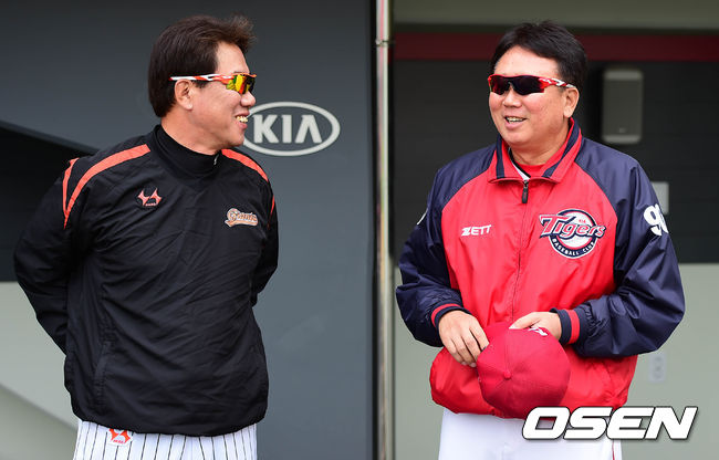 경기에 앞서 롯데 김시진 감독과 KIA 선동렬 감독이 이야기를 나누고 있다.