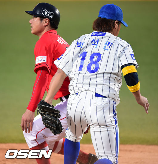 11일 오후 대구구장에서 열린 '2014 한국야쿠르트 세븐 프로야구' 삼성 라이온스와 SK 와이번스의 경기,2회초 무사 2루 SK 나주환의 번트때 2루 주자 박정권이 3루에서 태그아웃되고 있다.