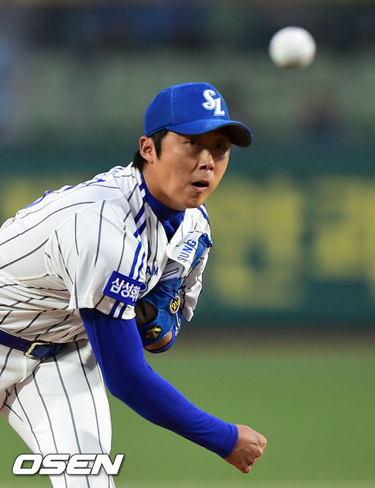 11일 오후 대구구장에서 열린 '2014 한국야쿠르트 세븐 프로야구' 삼성 라이온스와 SK 와이번스의 경기, 1회초 삼성 선발투수 배영수가 역투하고 있다.