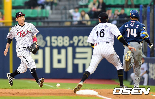 11일 오후 서울 잠실구장에서 열린 '2014 한국야쿠르트 세븐 프로야구' LG 트윈스와 NC 다이노스의 경기 1회초 1사 만루 테임즈의 내야땅볼 상황, 2루수 손주인의 실책으로 테임즈가 1루에서 세이프되고 있다. 그사이 3루주자 이종욱은 득점.