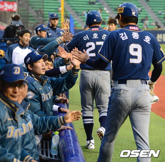 11일 오후 서울 잠실구장에서 열린 '2014 한국야쿠르트 세븐 프로야구' LG 트윈스와 NC 다이노스의 경기 1회초 1사 만루 모창민의 2타점 적시타에 홈을 밟은 2루주자 이호준과 3루주자 김종호가 덕아웃에서 동료들과 하이파이브를 하고 있다.