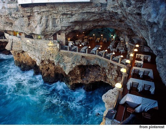 사진 속에는 바다와 맞닿은 절벽에 위치한 레스토랑이 멋진 절경을 자랑하고 있다. 파도가 높으면 테이블까지 미치기도 한다는 것이 게시자의 설명.
