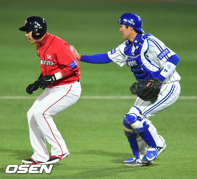 11일 오후 대구구장에서 열린 '2014 한국야쿠르트 세븐 프로야구' 삼성 라이온스와 SK 와이번스의 경기, 3회초 무사 1루 SK 김강민의 타석때 1루 주자 박진만이 협살에 걸려 아웃되고 있다.
