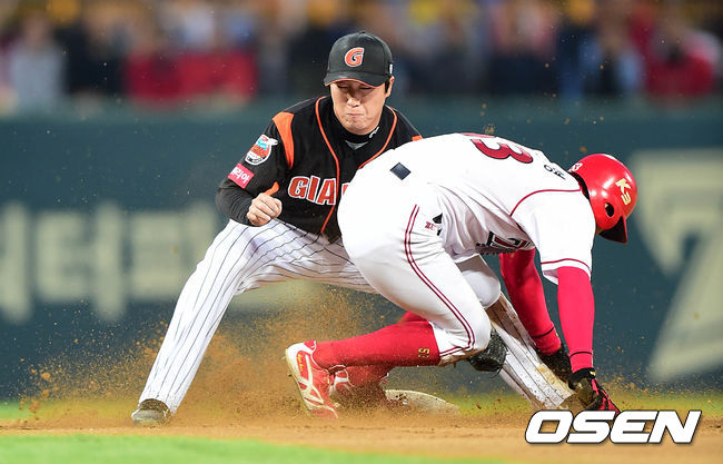 1회말 1사 1루에서 KIA 필타석 때 롯데 정훈이 1루주자 이대형의 도루를 저지하고 있다.