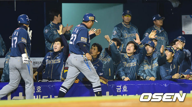 11일 오후 서울 잠실구장에서 열린 '2014 한국야쿠르트 세븐 프로야구' LG 트윈스와 NC 다이노스의 경기 2회초 1사 만루 모창민의 3타점 2루타에 홈을 밟은 이호준과 나성범이 덕아웃에서 동료들과 하이파이브를 하고 있다.