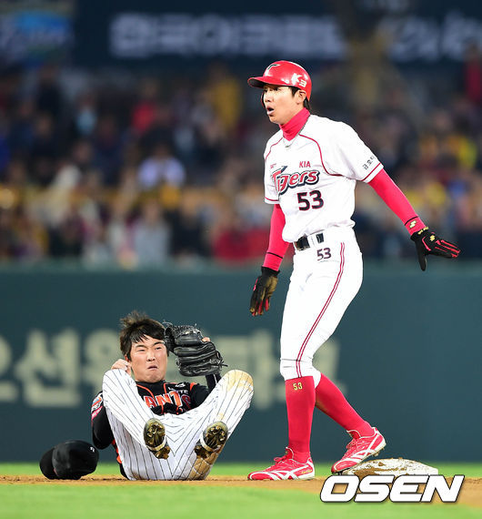 1회말 1사 1루에서 KIA 필타석 때 1루주자 이대형이 도루에 실패하고 있다.