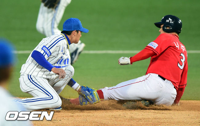 11일 오후 대구구장에서 열린 '2014 한국야쿠르트 세븐 프로야구' 삼성 라이온스와 SK 와이번스의 경기, 2회초 1사 1루 SK 박재상의 타석때 1루 주자 나주환이 도루 실패하고 있다.