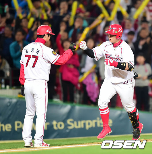 2회말 무사에서 KIA 나지완이 좌월 솔로 홈런을 날리고 3루에서 김종국 코치와 하이파이브를 하고 있다.