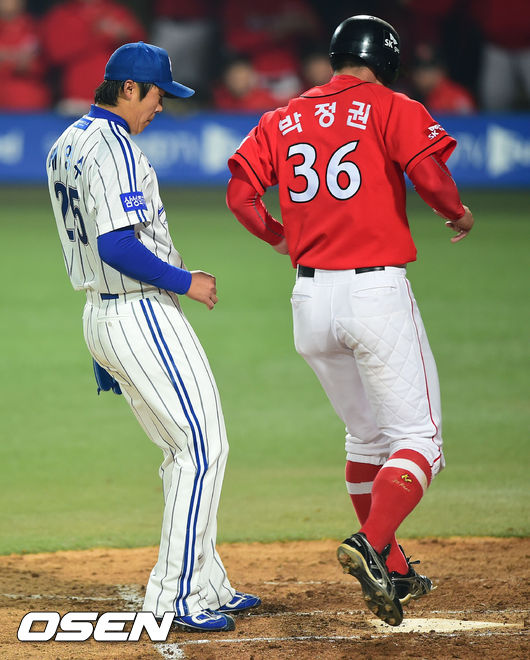 11일 오후 대구구장에서 열린 '2014 한국야쿠르트 세븐 프로야구' 삼성 라이온스와 SK 와이번스의 경기, 4회초 2사 2,3루 SK 박재상의 타석때 폭투 던진 삼성 배영섭 선발투수가 선취점을 허용하고 있다.