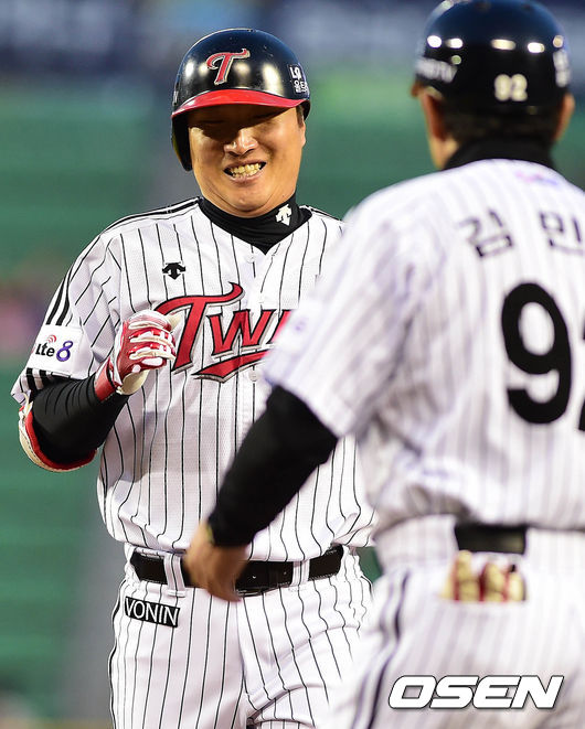11일 오후 서울 잠실구장에서 열린 '2014 한국야쿠르트 세븐 프로야구' LG 트윈스와 NC 다이노스의 경기 1회말 1사 3루 이진영이 1타점 적시타를 치고 1루에서 기뻐하고 있다.