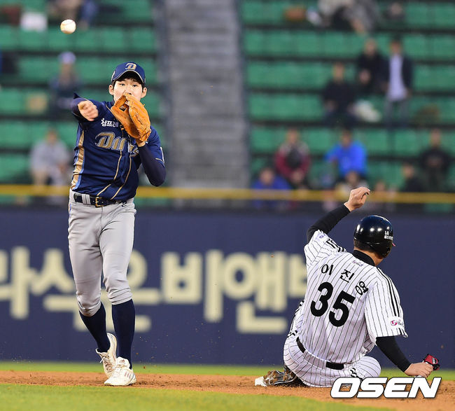 11일 오후 서울 잠실구장에서 열린 '2014 한국야쿠르트 세븐 프로야구' LG 트윈스와 NC 다이노스의 경기 1회말 1사 1루 정의윤의 병살타를 박민우가 2루에서 이진영을 포스아웃 시킨 후 1루로 송구하고 있다.