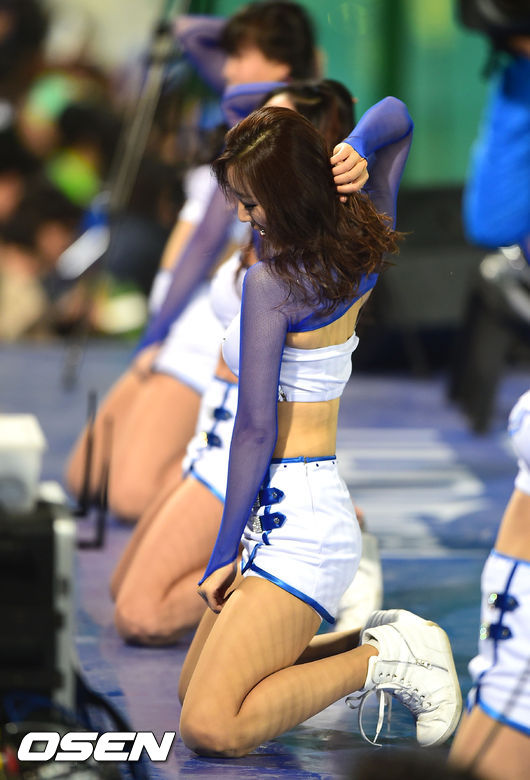 11일 오후 대구구장에서 열린 '2014 한국야쿠르트 세븐 프로야구' 삼성 라이온스와 SK 와이번스의 경기, 삼성 치어리더가 멋진 무대를 펼치고 있다