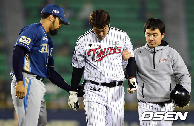 11일 오후 서울 잠실구장에서 열린 '2014 한국야쿠르트 세븐 프로야구' LG 트윈스와 NC 다이노스의 경기 3회말 1사 만루 오지환의 내야땅볼 상황, 1루주자 정의윤이 2루에서 손시헌과 충돌후 왼쪽 손의 고통을 호소하며 그라운드를 빠져나가고 있다.
