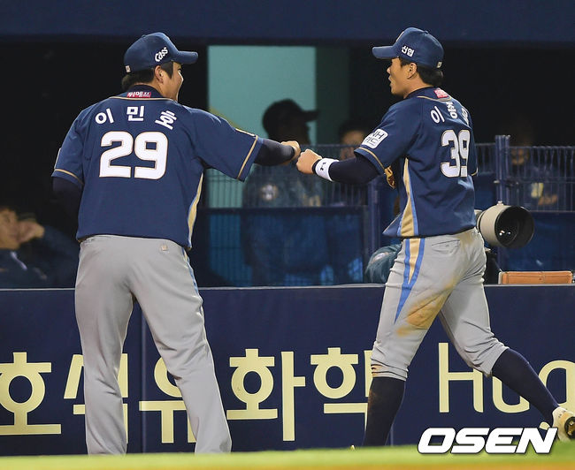 11일 오후 서울 잠실구장에서 열린 '2014 한국야쿠르트 세븐 프로야구' LG 트윈스와 NC 다이노스의 경기 3회말 2사 2,3루 대타 이병규의 외야 플라이를 잡은 이종욱이 덕아웃으로 향하며 이민호와 하이파이브를 하고 있다.