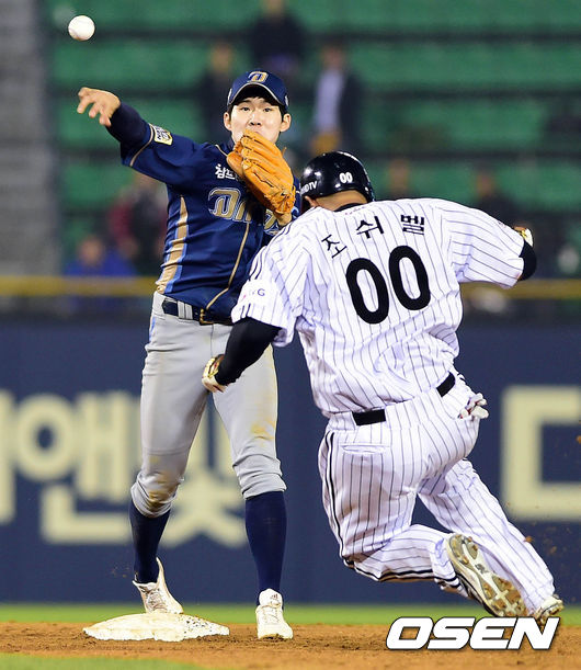 11일 오후 서울 잠실구장에서 열린 '2014 한국야쿠르트 세븐 프로야구' LG 트윈스와 NC 다이노스의 경기 4회말 1사 1,2루 이진영의 내야땅볼 상황, 박민우가 2루에서 조쉬 벨을 포스아웃 시킨 후 1루로 송구하고 있다. 이진영은 1루에서 세이프.