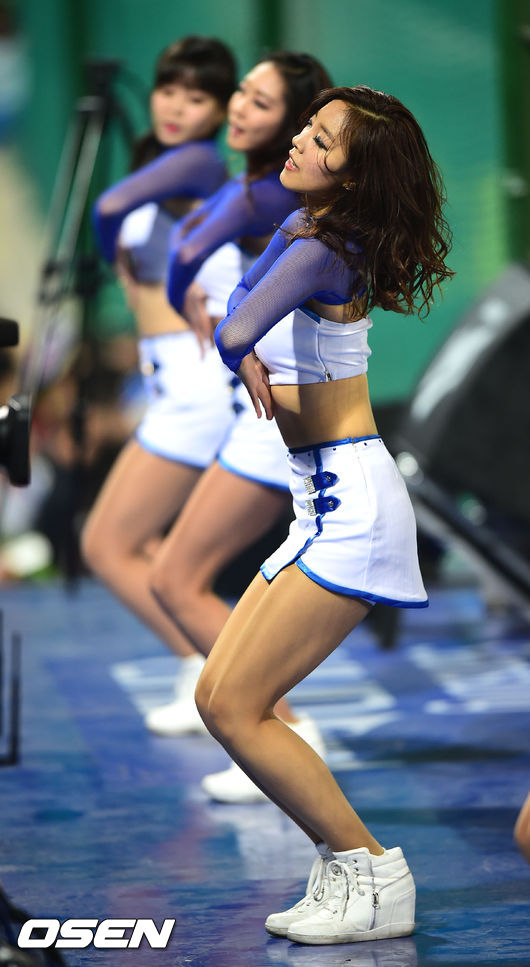 11일 오후 대구구장에서 열린 '2014 한국야쿠르트 세븐 프로야구' 삼성 라이온스와 SK 와이번스의 경기, 삼성 치어리더가 멋진 무대를 펼치고 있다