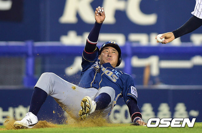11일 오후 서울 잠실구장에서 열린 '2014 한국야쿠르트 세븐 프로야구' LG 트윈스와 NC 다이노스의 경기 6회초 1사 2,3루 이종욱의 2루수 앞 땅볼 상황, 홈으로 쇄도하던 3루주자 김태군이 런다운에 걸려 넘어지고 있다. 김태군은 태그아웃. 이종욱은 1루에서 세이프.
