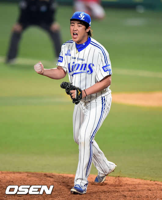 11일 오후 대구구장에서 열린 '2014 한국야쿠르트 세븐 프로야구' 삼성 라이온스와 SK 와이번스의 경기, 8회초 위기를 넘긴 삼성 안지만이 환호하고 있다.