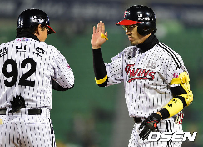 11일 오후 서울 잠실구장에서 열린 '2014 한국야쿠르트 세븐 프로야구' LG 트윈스와 NC 다이노스의 경기 6회말 무사 1,2루 정성훈이 1타점 적시타를 치고 김민호 코치와 하이파이브를 하고 있다.