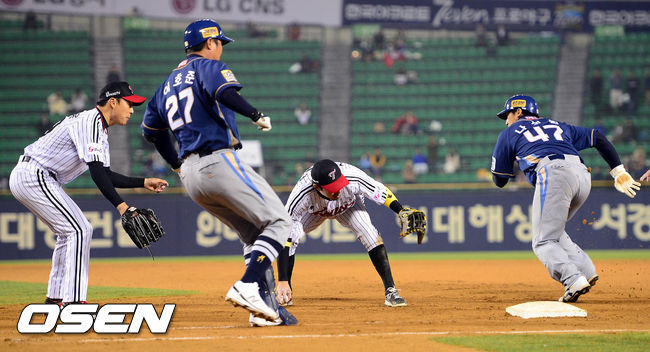 11일 오후 서울 잠실구장에서 열린 '2014 한국야쿠르트 세븐 프로야구' LG 트윈스와 NC 다이노스의 경기 7회초 무사 1루 이호준의 1루수 앞 땅볼 상황, 정성훈이 타구를 잡아 2루로 송구 나성범을 포스아웃 시키고 있다. 이호준은 1루에서 세이프.