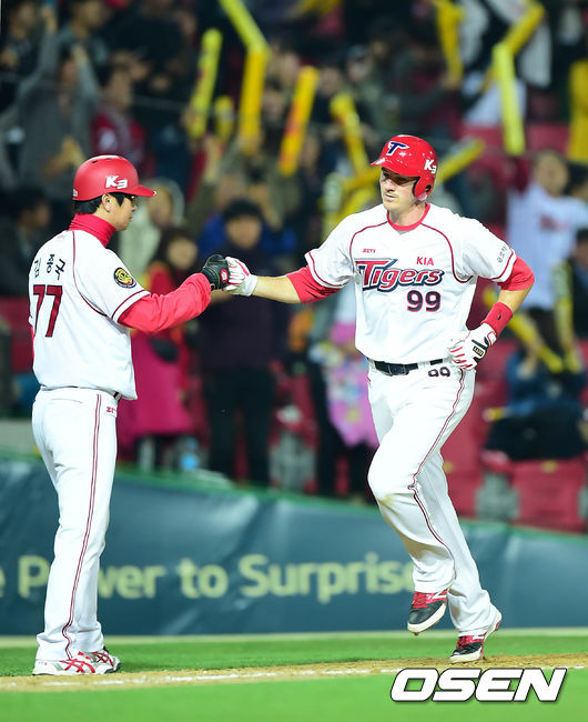 8회말 2사에서 KIA 필이 좌월 솔로홈런을 치고 김종국 코치와 하이파이브를 하고 있다.