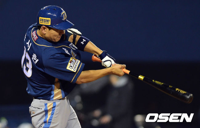 11일 오후 서울 잠실구장에서 열린 '2014 한국야쿠르트 세븐 프로야구' LG 트윈스와 NC 다이노스의 경기 7회초 2사 1,2루 손시헌이 1타점 적시타를 치고 있다.